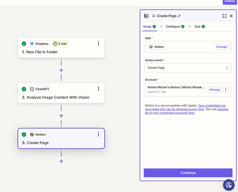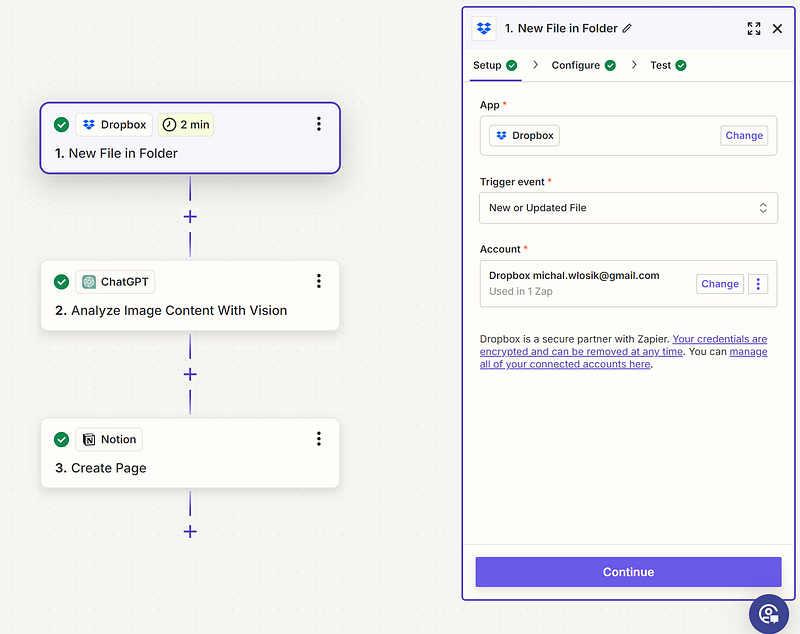 Now, go to your Zapier dashboard and click on “Create Zap”. Our zap will consist of three steps: step 1. monitoring the Dropbox folder for new or updated files, step 2. analyzing images, and step 3. creating Notion Pages.