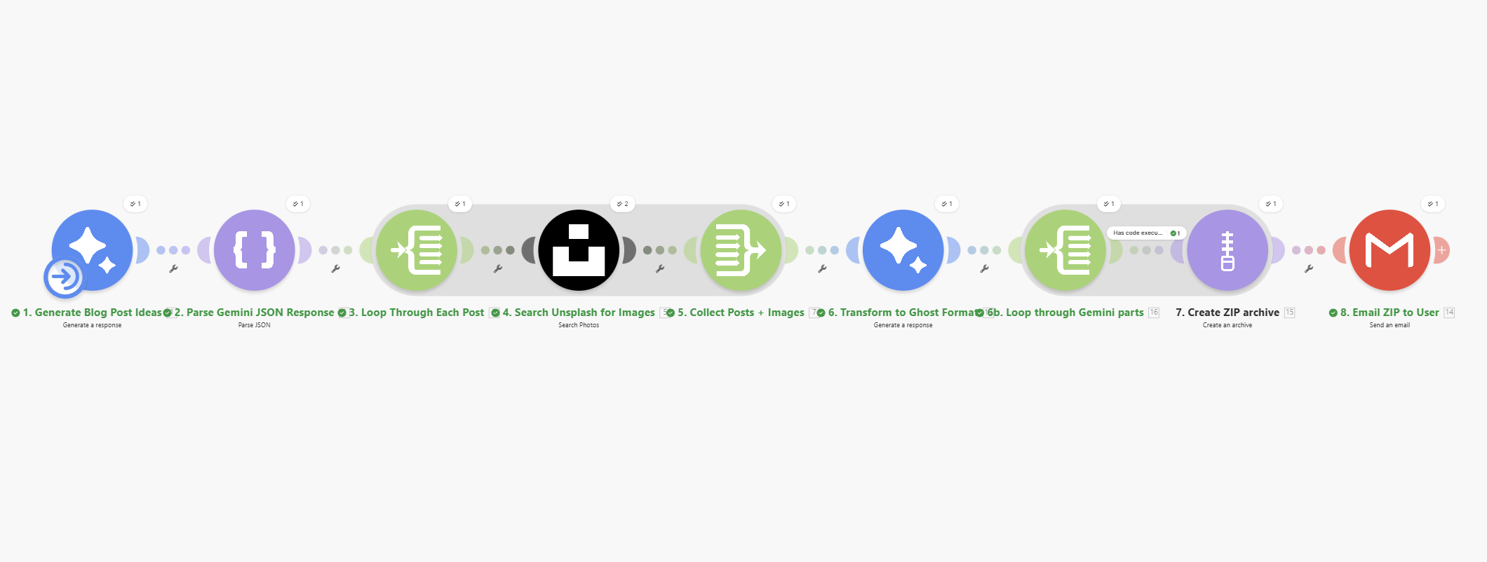 This automation creates professional content with proper formatting, SEO metadata, hero images from Unsplash, and packages everything into a ZIP file you can import directly into Ghost.