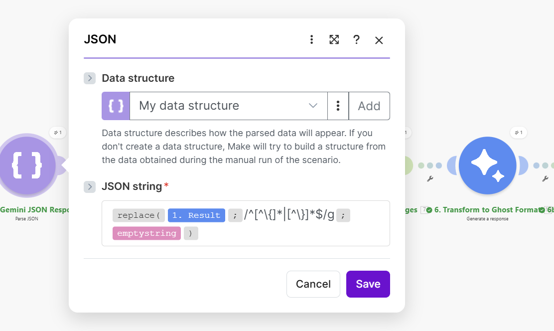 This formula strips any text before the first { and after the last }, ensuring we get clean JSON even if Gemini adds explanatory text.