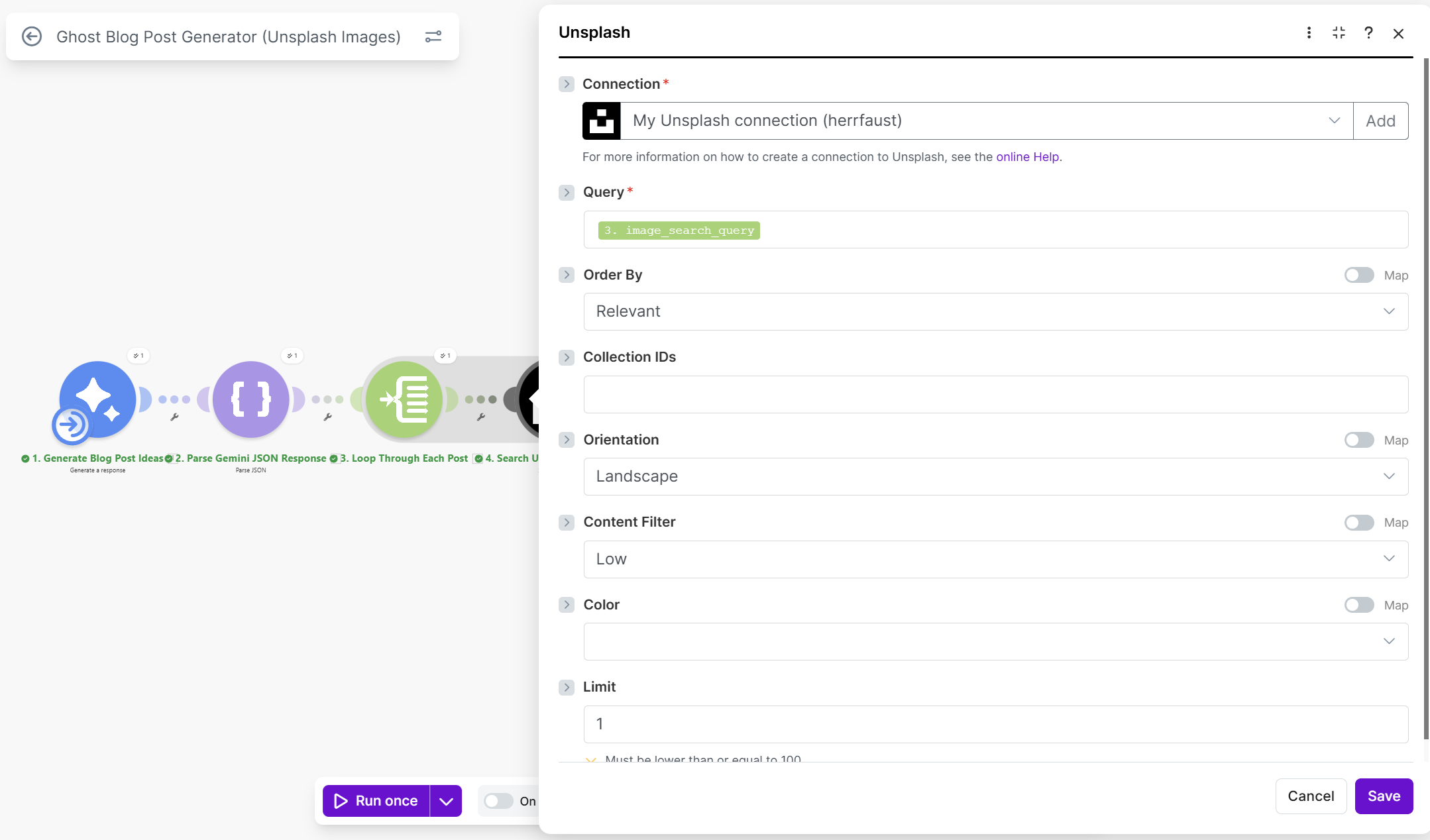 - Update the connections (Gemini, Unsplash, Gmail) with your own credentials