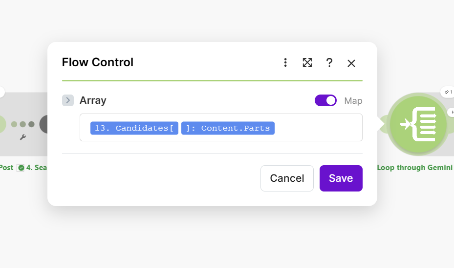 | Array | {{13.candidates[].content.parts}} |