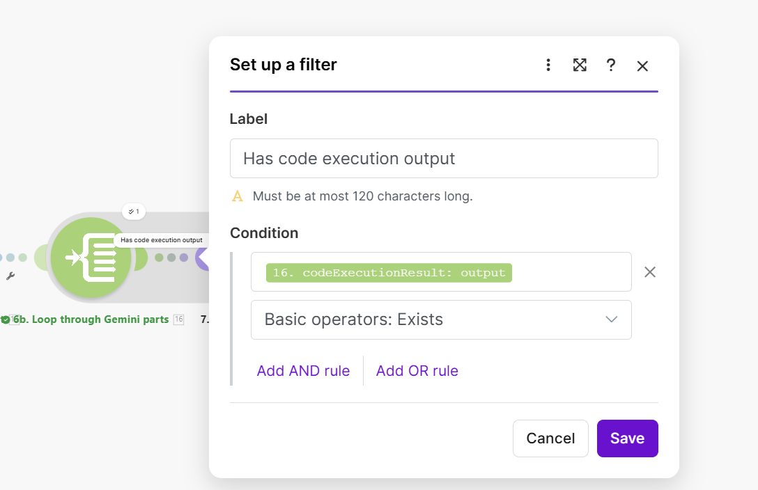 | Condition | {{16.codeExecutionResult.output}} exists |