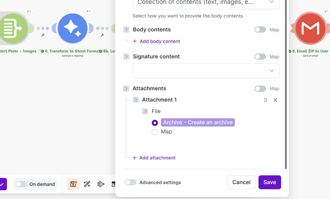 - Gmail module in Make.com to receive the finished ZIP file