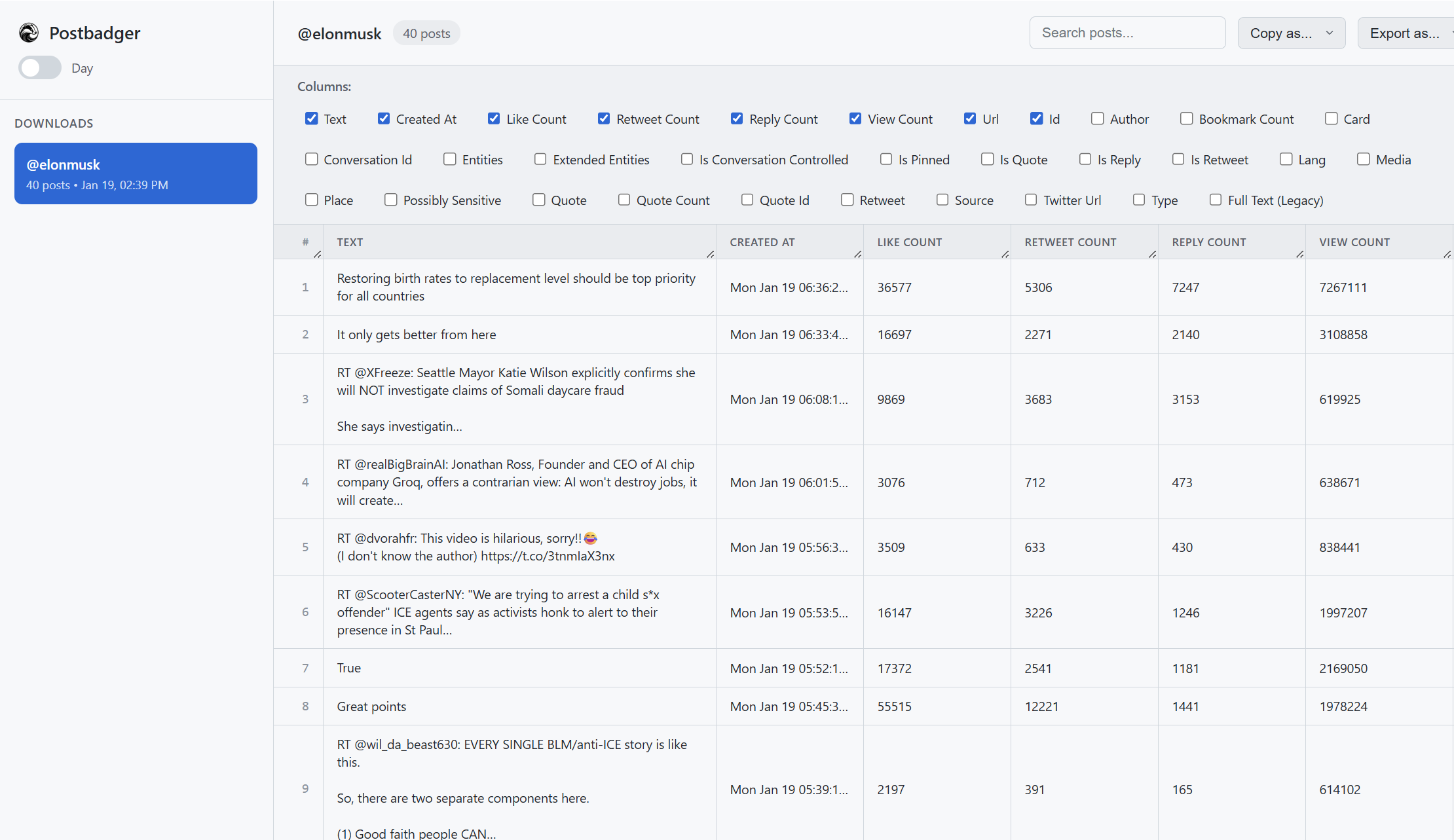 Postbadger turns any X profile into structured data you can actually use - for competitor research, content analysis, or feeding to Claude/ChatGPT.