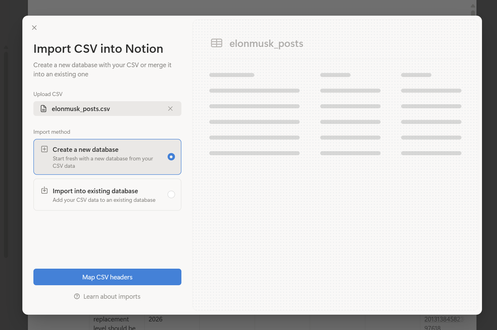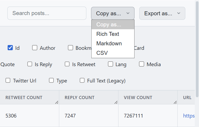 - Weekly: Export the past week's posts from Postbadger, merge the CSV into your existing Notion database. Notion will add new rows without duplicating existing ones (as long as the URL column matches).