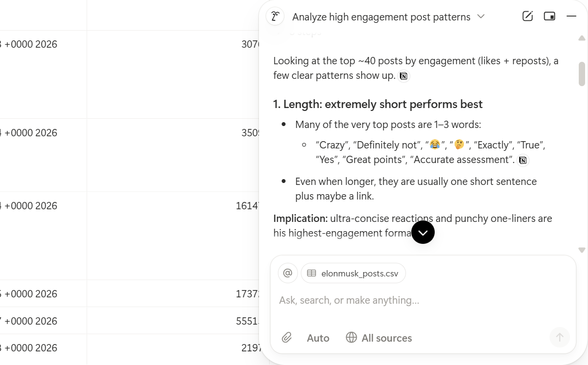 Once your posts are in a Notion database, you can use Notion's built-in AI assistant to get immediate insights without leaving the platform. This turns your static content archive into an interactive analysis tool.