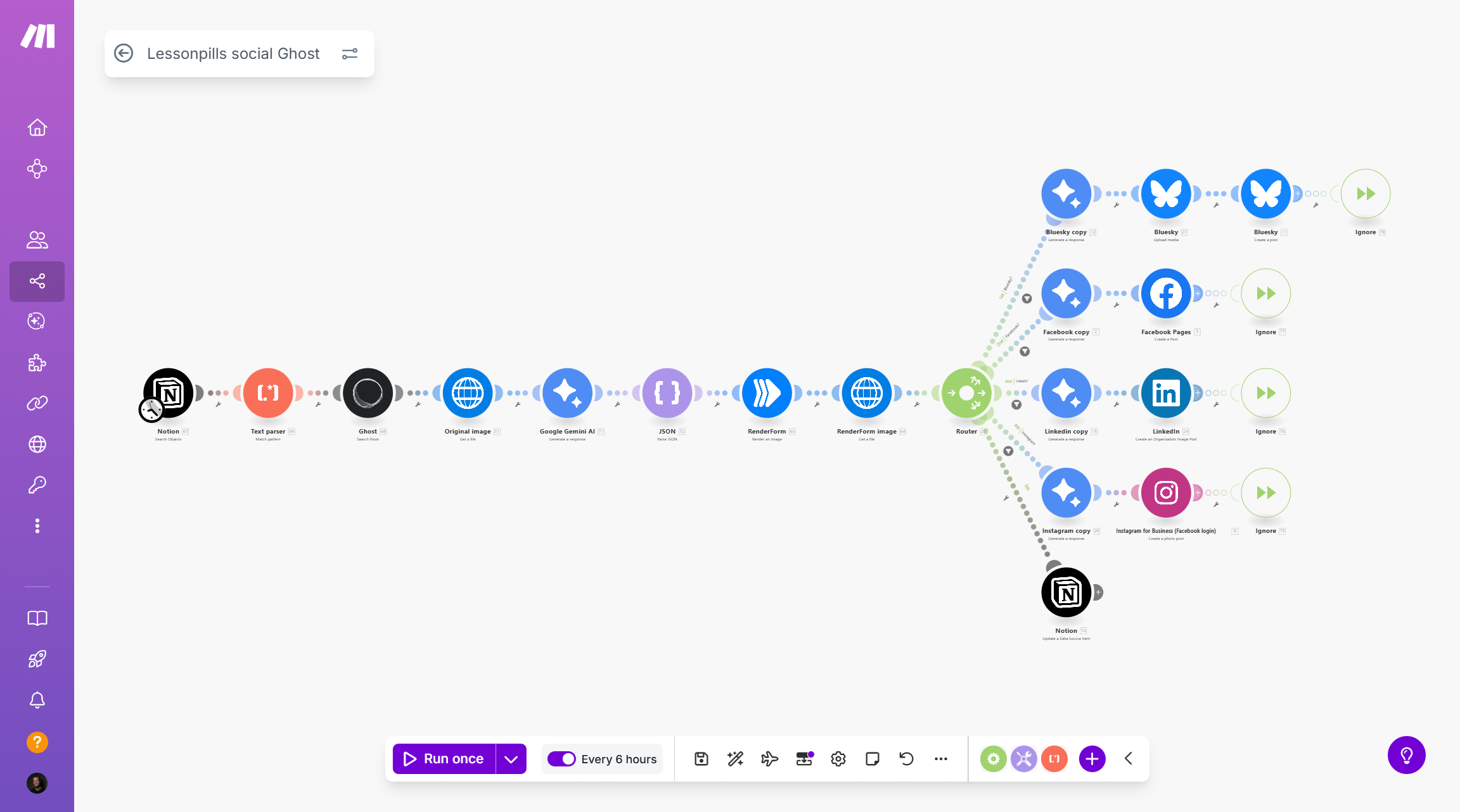 After the lesson is published, a separate automation scenario takes over to guarantee maximum visibility across all primary social channels. This eliminates the manual, repetitive task of repurposing and posting.